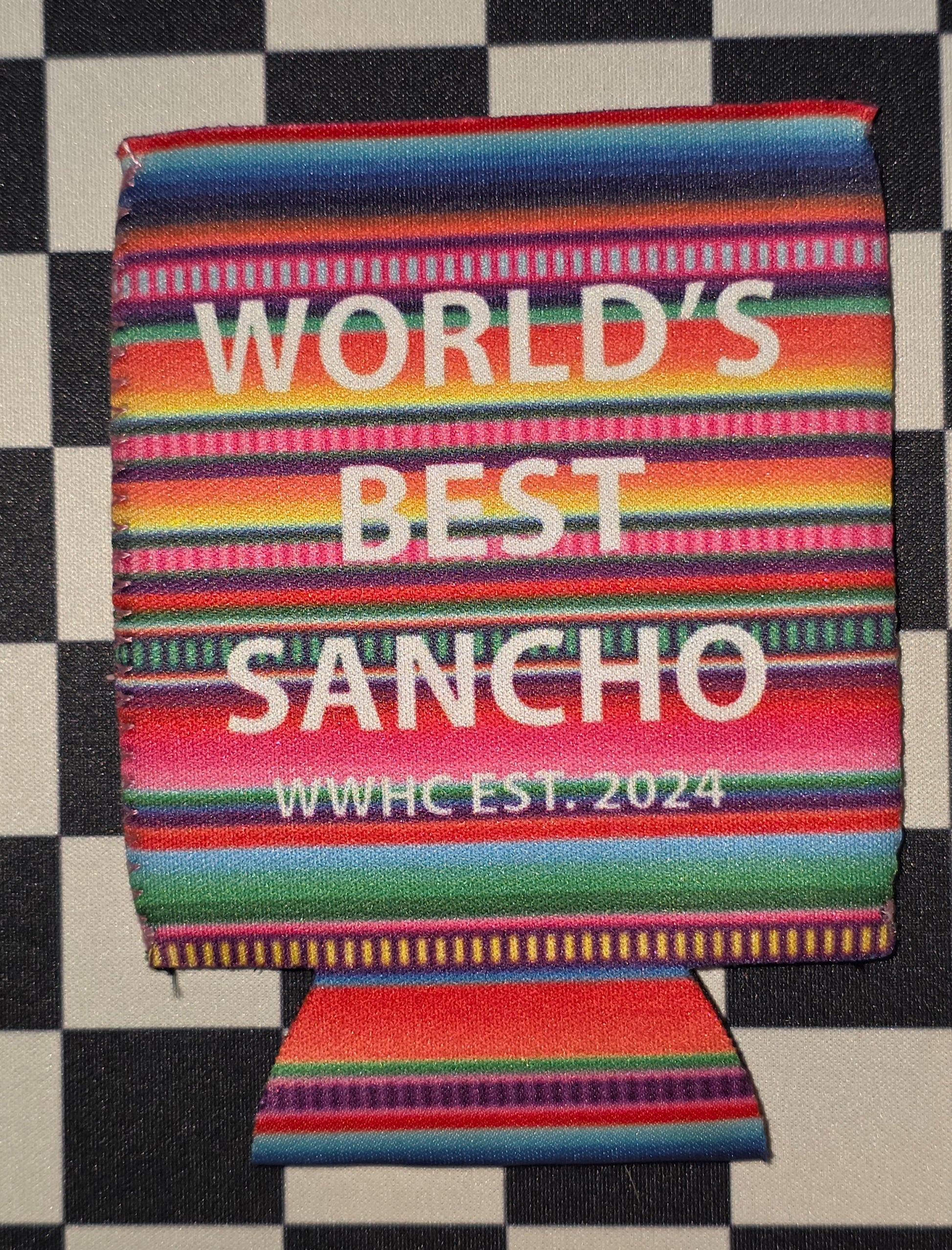 Rock vibrant stripes and keep your drink icy! This neoprene can cooler features a cool serape design with "Wild Wolf Hat Co." and "World's Best Sancho" logos.