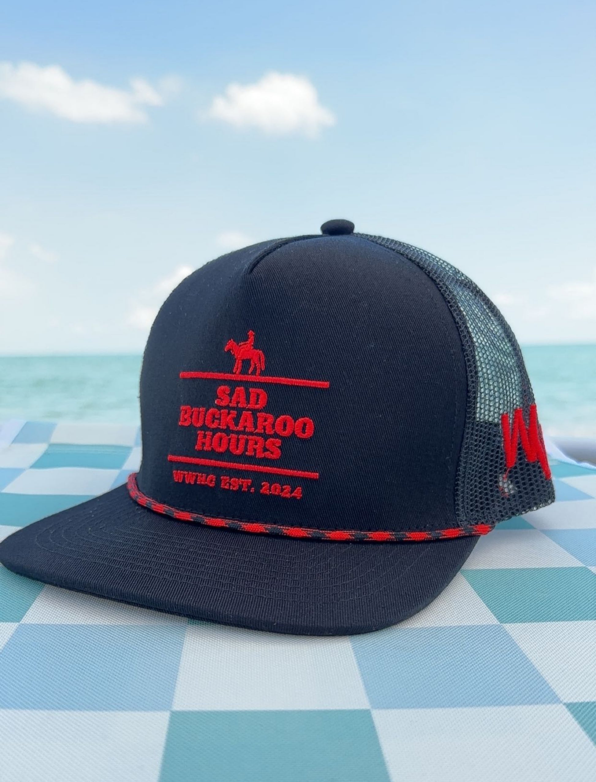 For the late nights, the long drives, and the heartaches. This is the official uniform for "Sad Buckaroo Hours." Our classic black trucker features bold red embroidery, a two-tone rope, and a breathable mesh back. When the sun goes down and the country music gets turned up, this is your hat.